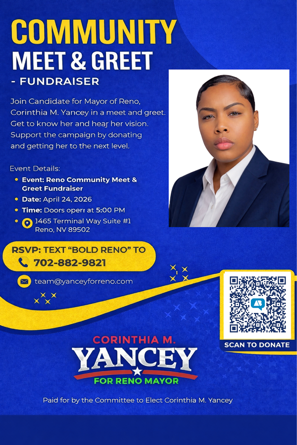 Join candidate for Mayor of Reno, Corinthia Yancey, in a meet and greet. Get to know her and hear her vision.
