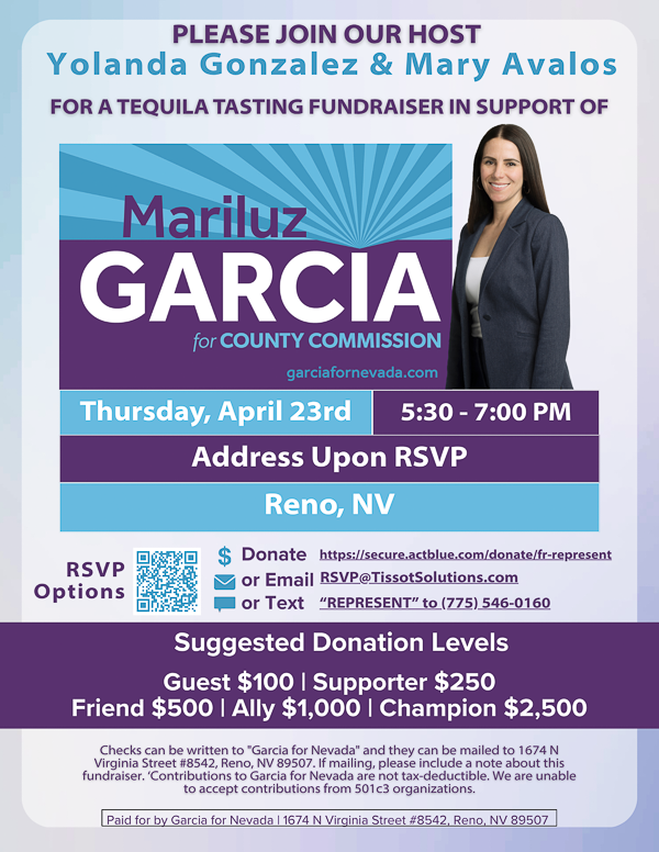 Checks can be written to “Garcia for Nevada” and brought to the event or mailed to 1674 N Virginia Street #8542, Reno, NV 89507. If mailing, please include a note about this fundraiser.