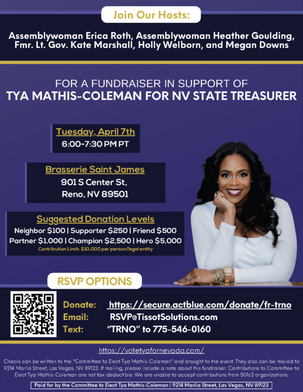 Checks can be written to the “Committee to Elect Tya Mathis-Coleman” and brought to the event or mailed to 9214 Marlia Street, Las Vegas, NV 89123. If mailing, please include a note about this fundraiser.