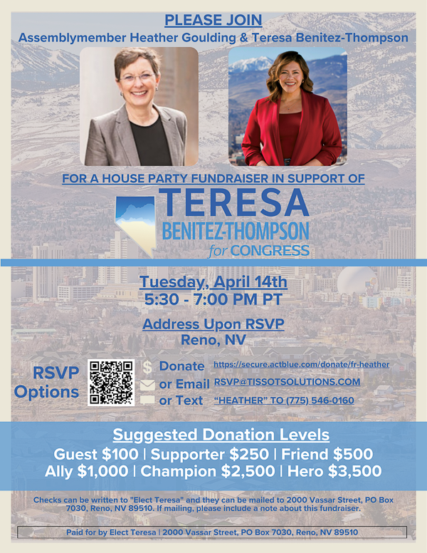Please join our host, Assemblymember Heather Goulding, for a House Party fundraiser in support of Teresa Benitez-Thompson for Nevada’s 2nd Congressional District