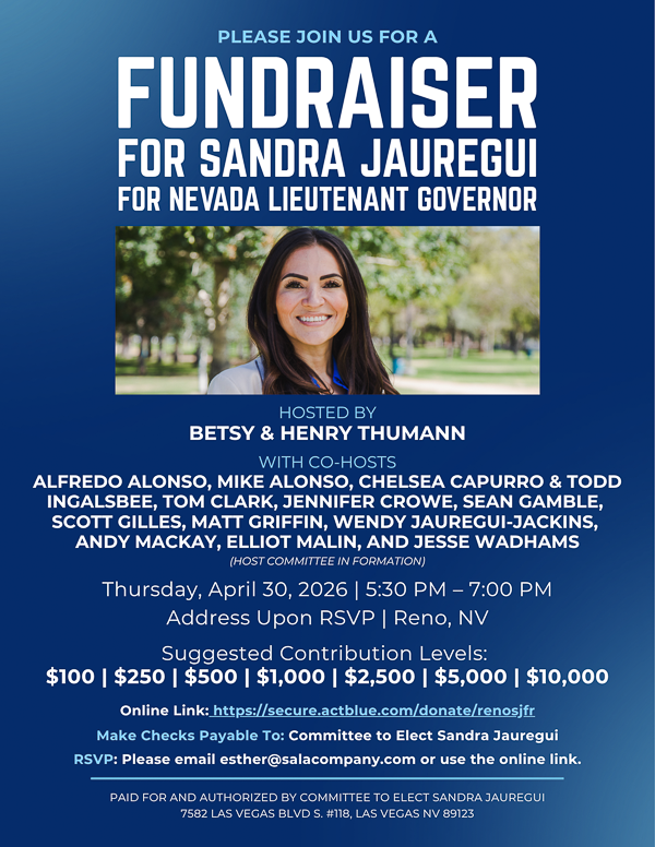 Please join us for a special Northern Nevada fundraising reception supporting Sandra Jauregui’s run to be Nevada’s next Lieutenant Governor. Your support will ensure Sandra has the momentum she needs to hit the ground running to win this November.