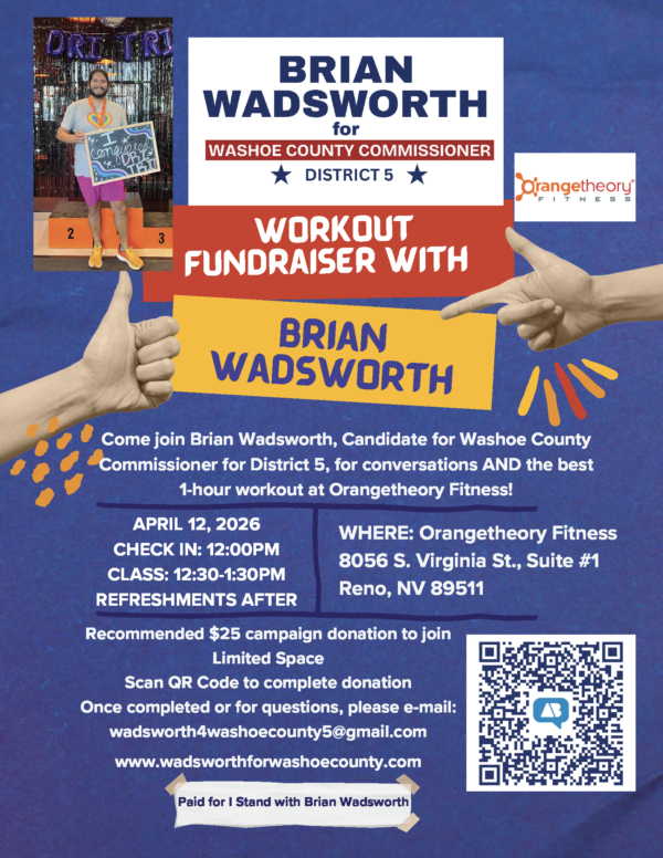 Join Washoe County Commissioner Democratic Candidate, Brian Wadsworth, for good conversations and a great workout at Orangetheory Fitness.