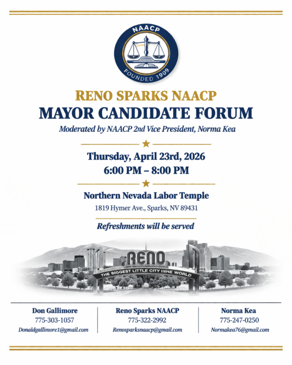 Thursday, April 23, 2026 6:00 PM – 8:00 PM Northern Nevada Labor Temple,1819 Hymer Avenue, Sparks, NV 89431 This forum will provide an opportunity for community members to hear directly from candidates and engage with key issues affecting Reno and Sparks. The event will follow a structured, moderated format to ensure a respectful and balanced […]