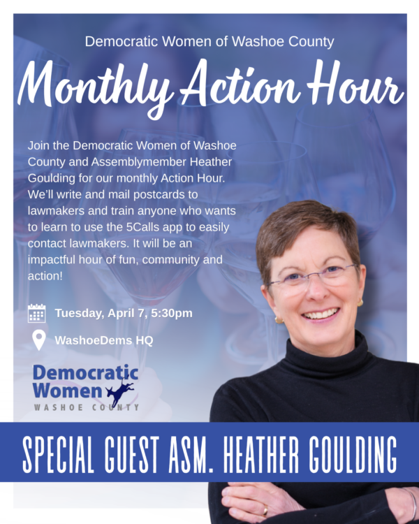 Join the Democratic Women of Washoe County and Assemblymember Heather Goulding for our monthly Action Hour. We’ll write and mail postcards to lawmakers and train anyone who wants to learn to […]