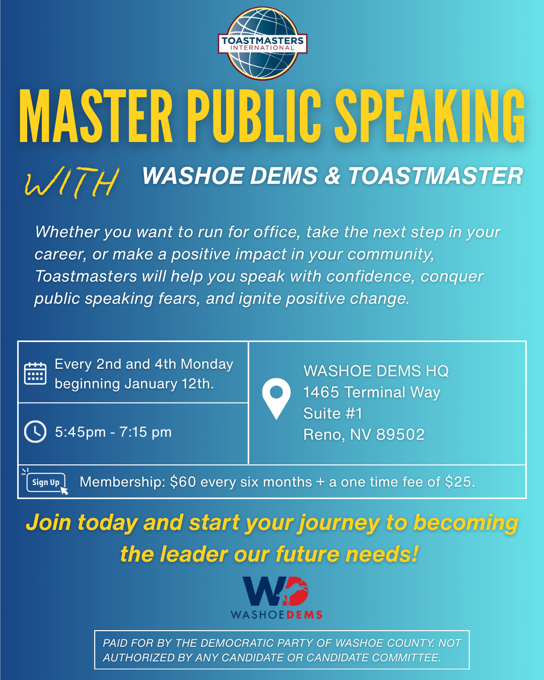 We're excited to announce that Washoe Dems is hosting our own Toastmasters series every 2nd and 4th Monday at Washoe Dems HQ. Whether you want to run for office, take […]