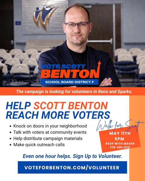 Walk with Scott for Washoe County School Board Tuesday, May 11th, 5:00pm RSVP to Masen at 775-219-2860 for location and more information