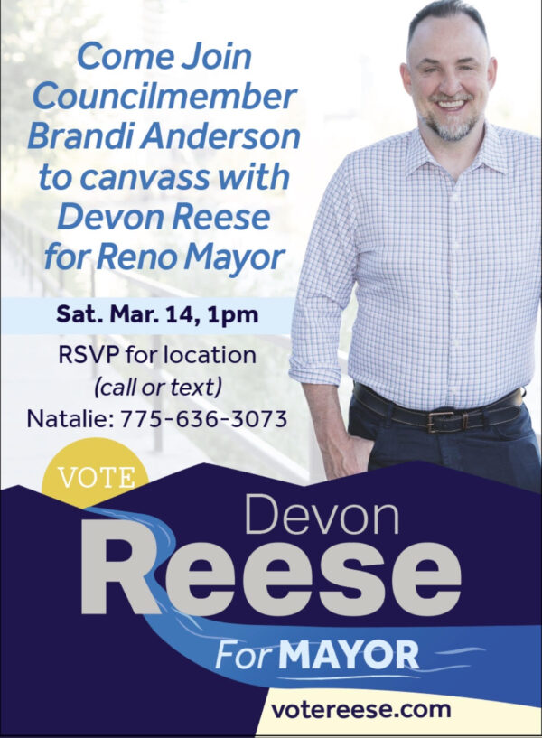 Come join Councilmember Brandi Anderson to canvass with Devon Reese for Reno Mayor!  When: Saturday, March 14th, 1:00 p.m. Where: RSVP for location RSVP (call or text) Natalie at 775-636-3073 […]