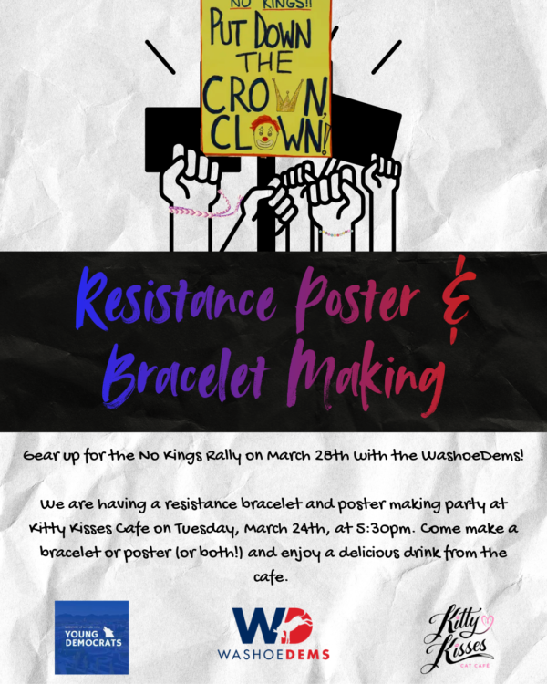 Gear up for the No Kings Rally on March 28th with the WashoeDEMS and the Young Dems!  We are having a resistance bracelet and poster making party at Kitty Kisses […]
